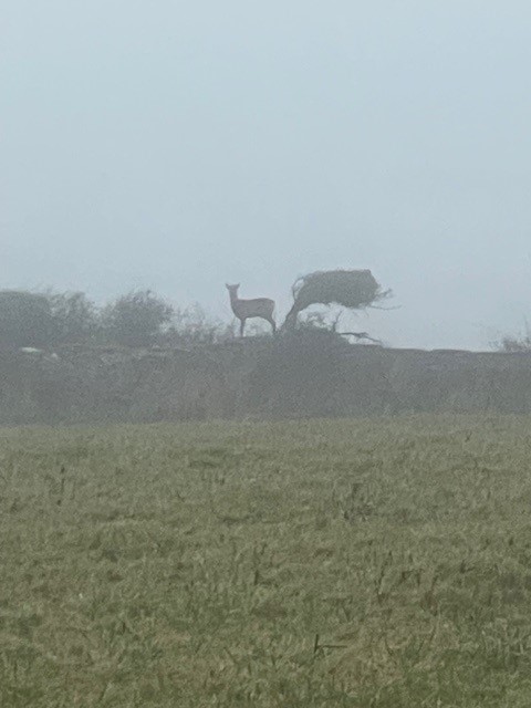 Bright green light Lichen coats the branches of Blackthorn as I pass through the drove through to Herrin Ground. Passing through Eight Acres I scan the wall line partially obscured by fog, the usually silhouette of scrub lines the wall when I come to a stop to see an unusual silhouette. The dark looming figure of a Roe Deer stood atop the wall is quite an amusing sight. It stands as still as a statue as I pass through the field probably hoping I don’t notice it. Even after checking the cows, who slowly loom into focus as I make my way across the field, the deer can still be seen stood stock still on the wall. I don’t know how long it stays there, as I slipe and slide my way though the mud along the drove between the two fields, I lose sight of it in the fog.
