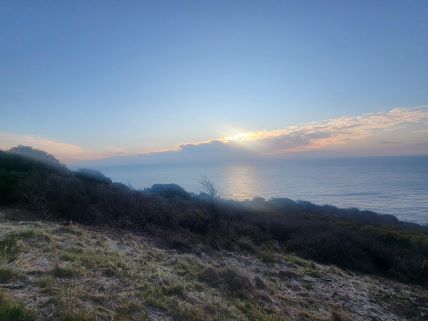 One continues the diagonal path, now giving way to a scrubby habitat with European Gorse, Blackthorn and Hawthorn, the sea is so beautiful and calm you can hear the Guillemots from up here, in fact you can see them! A Jay is heard screeching in the nearby copse, a Wood Pigeon as well as Feral Pigeon are seen, 4 Linnets are spotted with there song above me, as well as a Robin clicking away on Gorse, and 4 crows on top of the metal towers – 2 fighting off 2 it seemed. Heard first then seen was a Dunnock singing away on leafless Tamarisk.