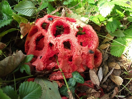 I walk down through the Timeline, admiring the great slabs of limestone which upright on either side of this trail. A grey Squirrel jumps along the wall in front of me, leaving a pile of shelled Acorns atop one of the coping stones. Below, I notice the ‘egg’ of Stinkhorn Fungus growing at the edge of the path. In a matter of days it will erupt into a revoltingly beautiful red cage, often covered in flies that have been attracted by it’s unpleasant smell.