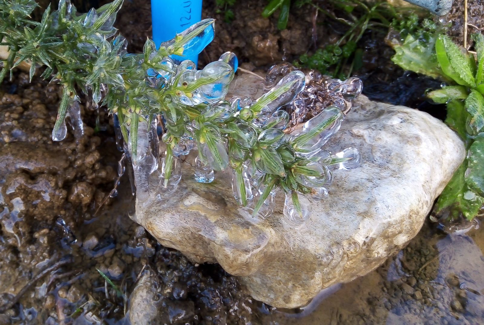 A flying and calling Raven landed and perched upon the lower mile marker. Drips of water from a trough had clocked Gorse needles which were frozen inside clear ice. Up in the sky a waning crescent moon was seen. As I reached the walling centre the sun beamed through the cloud. Wrap up warm today as the temperature was -1.5 at 9am!
